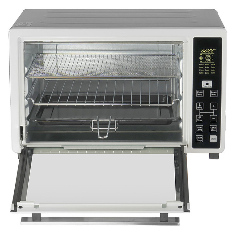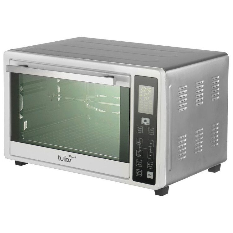 آون توستر برقی تولیپس Tulips مدل OT-3807 BD با توان 1500 وات و گنجایش 38 لیتر به شما این امکان را می دهد تا بتوانید به راحتی و با صرف زمان کمی حجم زیادی از انواع مواد غذایی شامل غذاهای گوشتی، نان و... را پخته یا روی قفسه مخصوص، گریل نمایید. این دستگاه مجهز به قطعه جوجه گردان بوده و درون محفظه چهار المنت حرارتی به صورت دو المنت در بالا و دو المنت در پایین قرار گرفته اند. از طریق درب شیشه ای دوجداره و به کمک لامپ روشنایی داخل فر و نمایشگر دیجیتال دستگاه نیز می توان بر مراحل پخت غذا نظارت کامل داشت. همچنین دستگیره درب از جنس استیل مقاوم ساخته شده و ظاهری زیبا به آن بخشیده است. آون توستر 3807 تولیپس مجهز به فن کانوکشن و توزیع هوای گرم بوده تا پخت سریع و یکنواختی داشته باشید. درجه حرارت پخت نیز قابل تنظیم است که توسط ولوم چرخشی از 40 تا 230 درجه سانتی گراد قابل کنترل می باشد و با توجه به حجم و نوع مواد غذایی می توان دمای مورد نیاز را به آسانی تنظیم نمود. با استفاده از ولوم های عملکرد می توان المنت ها را در 4 وضعیت مختلف شامل وضعیت خاموش، المنت بالا، المنت پایین و هر دو المنت قرار داد، ولوم کنترلی دیگر قابل تنظیم در 4 وضعیت خاموش، جوجه گردان، فن هوای گرم و جوجه گردان همراه با فن هوای گرم می باشد. به کمک ولوم تایمر نیز می توانید بر حسب نوع پخت و حجم مواد غذایی زمان مناسب پخت غذا را تا 60 دقیقه با قابلیت قطع خودکار تنظیم نمایید, این دستگاه دارای میوه خشک کن هم میباشد.