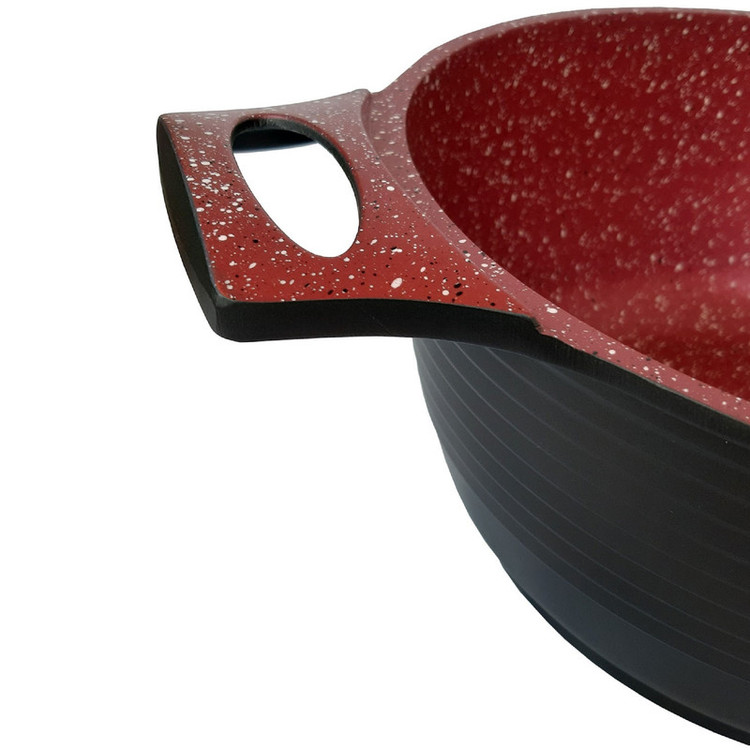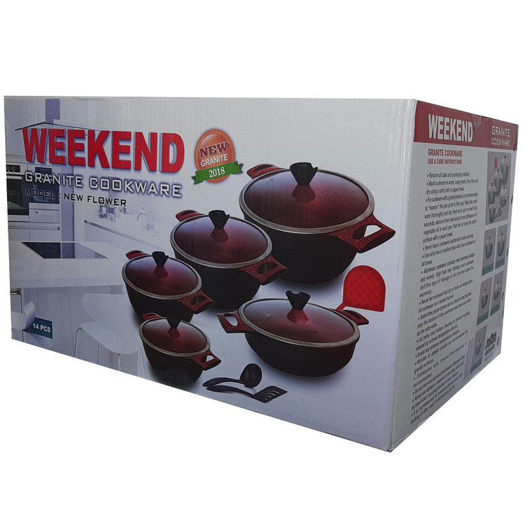 سرویس چهارده پارچه گرانیتی نچسب ویکند، مدل New Flower، دارای چهار قابلمه و یک تابه به همراه پنج درب پیرکس، کفگیر، ملاقه و دستگیره است. پوشش گرانیتی داخل آن از بهترین مواد اولیه و دارای عمر طولانی و پوشش خارجی نیز بسیارشکیل و با دوام است. دستگیره های آن به صورت یکپارچه و از جنس بدنه ساخته شده که در هنگام پخت غذا بوی بد از آن متصاعد نمی شود و به علت نداشتن پیچ اتصال، از شل شدن دستگیره جلوگیری می گردد. در میان پوششهای نچسب ظروف، پوشش گرانیت از همه بادوامتر و سختتر است. گرانیت نام دیگر سنگ خاراست. همچنین به دلیل سنگی بودناش گرما را در خود نگه داشته و غذا در آن دیرتر از ظروف معمولی میسوزد و تکنولوژی بکاررفته در قسمت تحتانی این محصولات را از شعله پخش کن بی نیاز میکند. در زمان استفاده از ظروف گرانیتی نچسب، مقدار استفاده از روغن کاهش یافته و به همین دلیل غذای پخته شده سالمتر خواهد بود. از دیگر خواص این ظروف تغییر ندادن طعم غذاست. گرانیت مادهای طبیعی است و طی سالیان سال در طبیعت به وجود آمده و پایدار شده است. دمایی که روی اجاق به گرانیت میدهیم، بسیار کمتر از مقداری است که در زمان تشکیلاش، به خود دیده است، به همین دلیل میتوان مطمئن بود که ملکولهای خود را حفظ نموده و با غذا ترکیب نمی شود.
