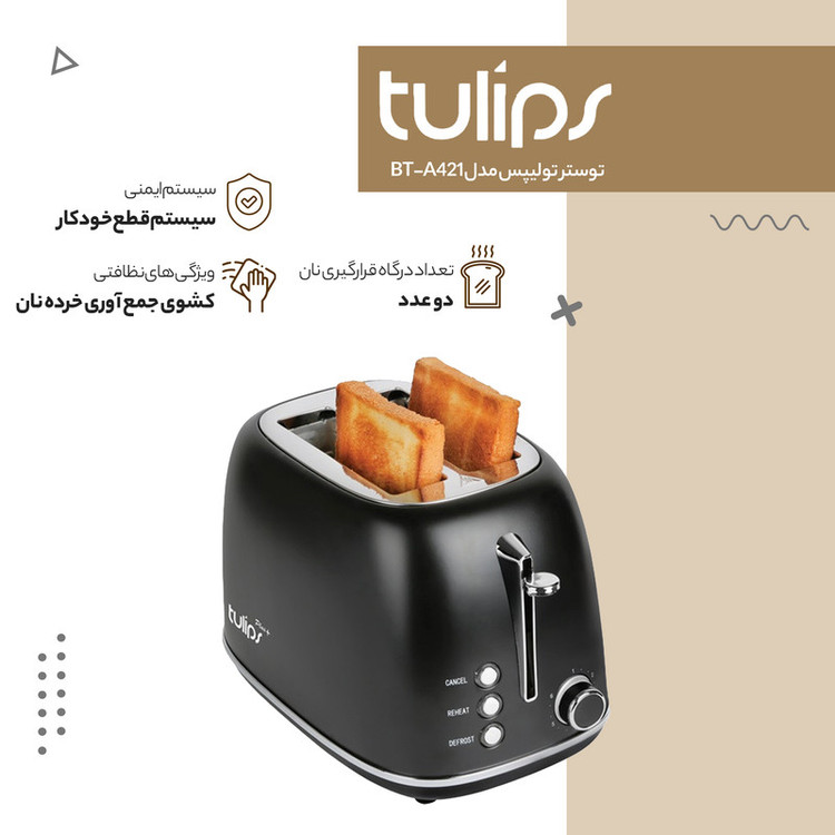 توستر امروزه از وسایل پر طرفدار و پرکاربرد برای آشپزخانه است . توستر نان مدل BT-A421 متناسب با سلایق مختلف به گونه ای طراحی شده که قابلیت برشته کردن نان را به صورت یکنواخت دارد و همچنین اگر نان های خریداری شده را داخل فیریزر نگهداری می کنید با دارا بودن دکمه دیفراست ( یخ زدایی ) درکمترین زمان به صورت یکنواخت نان را یخ زدایی می کند. از ویژگی های دیگر این مدل داشتن دکمه قطع اضطراری است که در هنگام نیاز می توانید از آن استفاده کنید. دارای سینی جمع آوری خرده نان است و همچنین از لحاظ شکل ظاهری دارای بدنه فلزی و رنگ مشکی است.