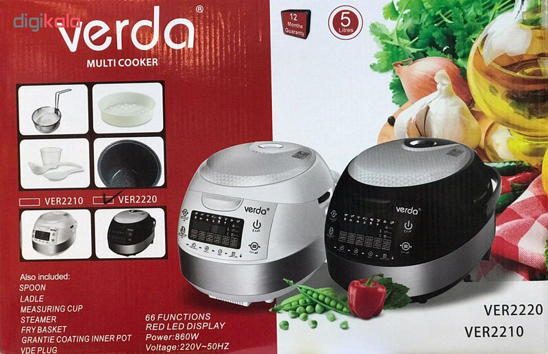 پلوپز وردا مدل 2220 VER دستگاهی زیبا و کارآمد که به بازار عرضه شده است. این دستگاه چندکاره است و امکانات زیادی دارد. بدنه آن پلاستیکی به همراه قطعات فلزی است که در تهیه آنها از مواد باکیفیت استفادهشده است. برای حمل کل دستگاه، دستگیرهای برای آن طراحی و روی آن نصبشده است. در دستگاه توسط یک دکمه روی آن باز میشود و به فضای داخلی دستگاه و دیگ پخت دسترسی پیدا میشود. واشر لاستیکی در باعث میشود تا فضای داخلی محفظه پخت تا حد زیادی عایقبندی شود و پخت بهتر و سریعتر انجام شود. ظرف پخت فلزی و روکش نچسب دارد تا تهیه برنج و تهدیگ بهراحتی انجامشده و تهدیگ خوشمزه و خوشرنگ از ظرف بهراحتی جدا شود. ظرف بخارپز کردن نیز همراه پلوپز وردا مدل verda2220 عرضه میشود که برای تهیه غذاهای سالم و بدون روغن استفاده میشود. پنل کنترلی این مدل بهصورت لمسی-فشاری عمل میکند و دسترسی به گزینههای مختلف پخت از طریق آن انجام میشود. صفحه نمایشگر نیز به انتخاب برنامههای دقیق پخت و مشاهده وضعیت فعالیت دستگاه کمک میکند. این دستگاه مجهز به 10 برنامه پخت است که با استفاده از دکمه منو می توان این برنامه های پخت را انتخاب نمود. برنامه های پخت شامل پخت برنج، کیک، سوپ، پخت سریع و آرام پز، بخار پز، سرخ کردن، حریره، ته دیگ، پخت انواع برنج و دوباره گرم کردن است. سیم برق در این مدل از بدنه جدا میشود تا در صورت نیاز بتوان سیم بلندتر جایگزین کرد و اگر به هر علتی سیم برق دچار قطعی شد بهسادگی جایگزین شود و نیاز به باز کردن دستگاه نیست.